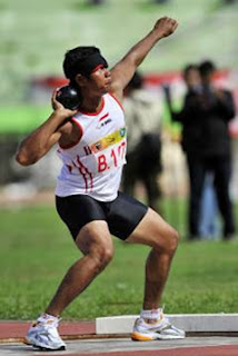 nomor lempar. Atlet tolak peluru melemparkan bola besi yang berat sejauh